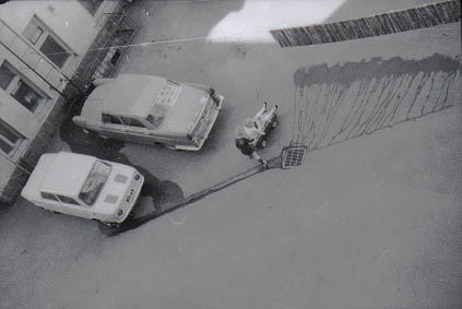 | Kaksi autoa, kaksi tyttöä polkuauton kanssa sekä narulla kuivuva, vettä valuva räsymatto Fleminginkatu 10:n pihalla Kalliossa. Näkymä tuuletusparvekkeelta. | |