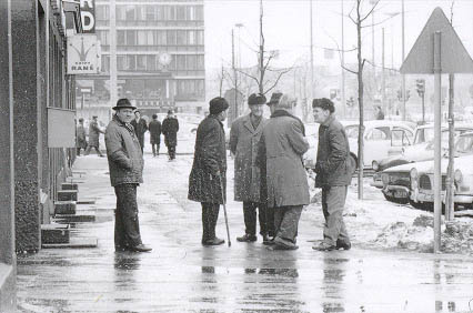 | Miehiä seisoskelemassa kadulla Hakaniementorin lähistöllä. | |