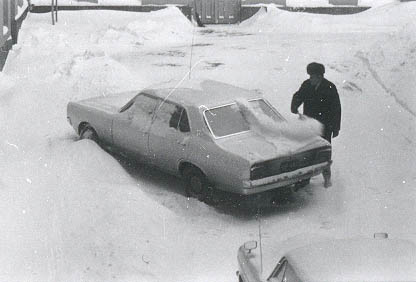 | Mies puhdistamassa lumista autoa Liisankatu 7:n pihalla. | |