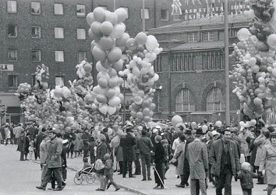 | Ilmapallon myyjiä Hakaniementorilla kauppahallin kulmilla vapunpäivänä 1970. | |