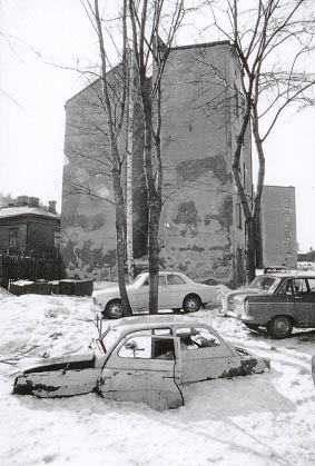 | Autonromu ja muita autoja lumessa Ruoholahdenkadun ja Lastenkodinkadun kulmassa. Taustalla rapistuneen kerrostalon pääty, Lastenkodinkatu 1. | |