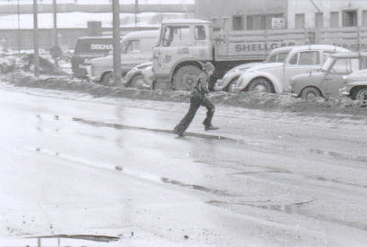 | Poika ylittämässä juosten loskaista katua Hakaniemessä. | |