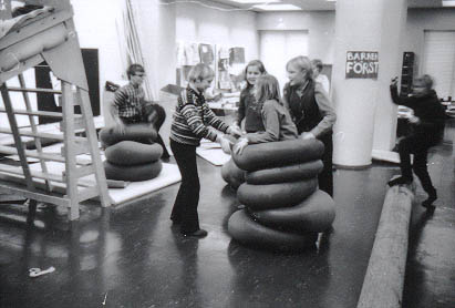 | Lastentapahtuma Amos Andersonin taidemuseossa Yrjönkadulla. Kuvassa lapsia leikkimässä renkailla. | |