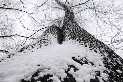 | Luminen, huurteinen kaksihaarainen puunrunko alhaalta latvaan päin kuvattuna Liisanpuistikossa. | |