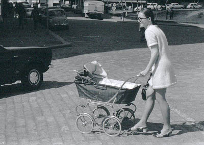 | Lastenvaunuja työntävä minihameinen nainen ylittämässä Siltasaarenkatua Neljännen linjan kulmassa. | |