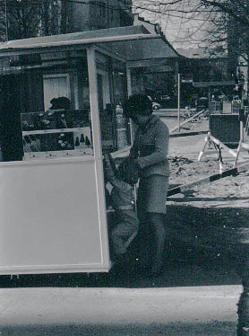 | Nainen ja tiskin reunalla roikkuva lapsi ostamassa jäätelöä Jäätelöyhtymän kioskilta Fleminginkadulla. | |