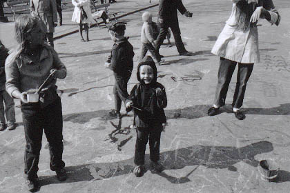 | Lapsia maalaamassa asfalttiin lastentapahtuman ajaksi liikenteeltä suljetulla Fleminginkadulla Karhupuiston kohdalla. | |