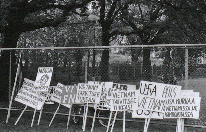 | Vietnamin sodan vastaisen mielenosoituksen kylttejä nojaamassa aitaan Kaisaniemen puistossa. | |