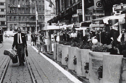 | Mies kantamuksineen kävelemässä Aleksanterinkadulla katukahvilan vierellä kävelykatukokeilun aikaan. | |