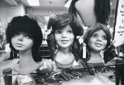 | Mallinukkeja peruukit päässä Stockmannin tavaratalon leluosastolla. | |