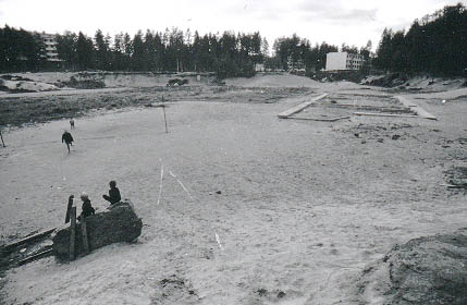 | Niinisaarentien varrella oleva hiekkakuoppa, kesät-talvet lasten oivallinen leikkipaikka Vuosaaressa. Taustalla tontille rakentamaan aloitetun maauimalan betoniperusta, joka on täytetty hiekalla. | |