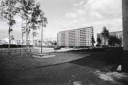 | Näkymä Kaarenjalka 10:n pihalta. Talon pihapiirissä hiekkalaatikko, taaempana parkkipaikka. Taustalla oikealla Kontulankaari 2:n korkeita kerrostaloja. | |