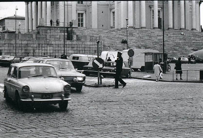 | Poliisi ohjaamassa liikennettä Unioninkadun ja Aleksanterinkadun kulmassa. | |