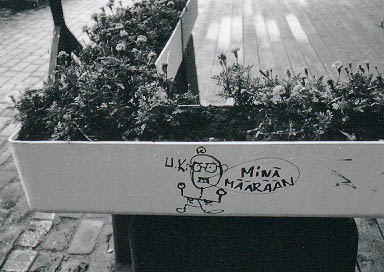 | Presidentti Kekkosen pilakuva ja teksti MINÄ MÄÄRÄÄN katukahvilan kukkalaatikossa Aleksanterinkadulla kävelykatukokeilun aikoihin. | |