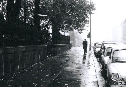 | Mies kävelemässä sateisella ja sumuisella Unioninkadulla. Taustalla Kirkkokadun kulma. | |