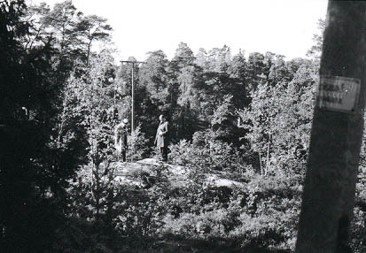 | Kaksi miestä kalliolla Jollaksessa. Taustalla Jollaksen kartanon rakenuksia, oikealle avautuu Saunalahti. Kuva otettu Villinginsalmentieltä. | |