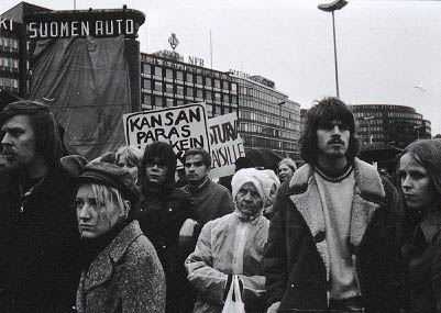| Asuntomielenosoitukseen osallistuvia ihmisiä ennen kulkueen liikkeelle lähtöä Hakaniementorilla. | |