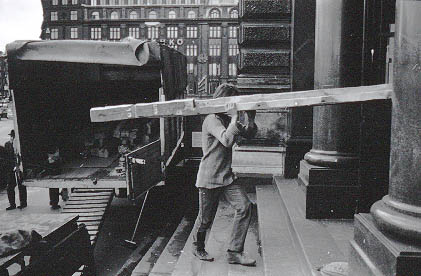 | Mies kantamassa harteillaan kuvanveistäjä Mauno Hartmanin veistokseen kuuluvaa hirttä näyttelyyn Ateneumin taidemuseon portaissa. | |
