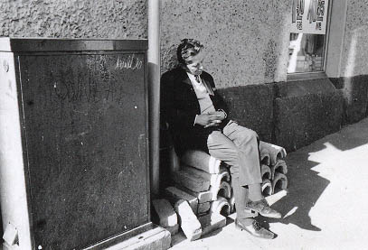 | Katutyömaan putkisuojien päällä kädet ristissä istuva, siististi pukeutunut, nukkuva mies Meritullinkadun ja Liisankadun kulmassa. | |