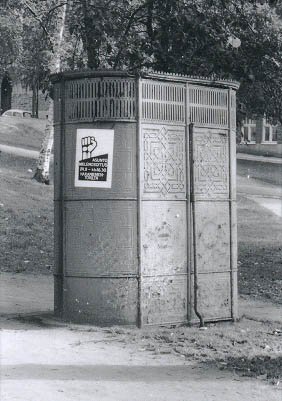 | Asuntomielenosoitusjuliste käymälän seinässä Johanneksenpuiston laidalla Laivurinrinteen ja Merimiehenkadun kulmassa. | |