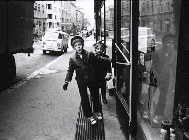 | Kaksi lasta kemikaliokaupan ovella Albertinkadulla Punavuoressa. Näkymä Iso Roobertinkadun kulmilta luoteeseen Kampin suuntaan, | |
