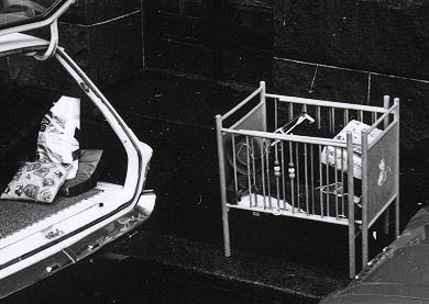 | Lasten pinnasänky auton perän luona Mikonkadulla. | |