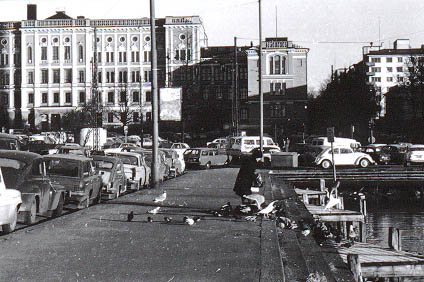 | Vanha nainen ruokkimassa lintuja Hietalahdenrannassa. Taustalla Hietalahdentori. | |