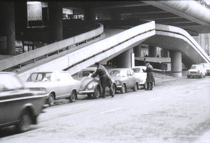 | Kaksi poliisia kirjoittamassa sakkolappuja Keskuskadulla Makkaratalon autoramppien luona. | |