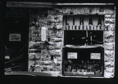 | Mariankadun Liha ja leikkele -liikkeen näyteikkuna kerrostalon kivijalassa, joka on päällystetty sanomalehdillä julkisivuremontin ajaksi. | |