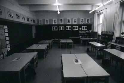 | Tyhjä luokkahuone Maunulan kansakoulussa. | |