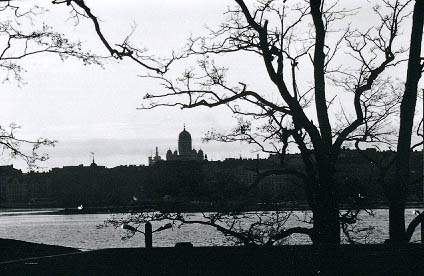 | Näkymä Korkeasaaresta Tuomiokirkon suuntaan. Etualalla lehdettömiä puita. | |
