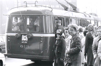 | Täpötäysi bussi, linja numero 14:n johdinauto sekä pysäkillä olevia ihmisiä Kampintorin laidalla Fredrikinkadulla. | |