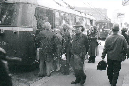 | Ihmisiä 14:n pysäkillä Kampintorin laidalla nousemassa ruuhkabussiin Fredrikinkadulla. | |