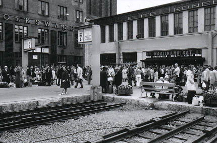 | Ihmisiä odottamassa junia asemalaiturilla Helsingin rautatieasemalla. Näkymä aseman sisäänkäynnin suuntaan, ovien yläpuolella mainostetaan Stadionilla 30.6.-1.7. järjestettäviä Maailmankisoja. | |