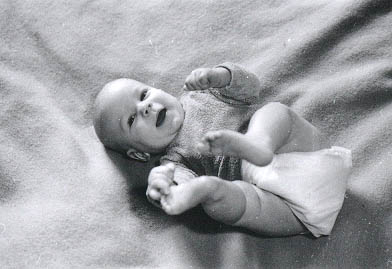 | Kolmen kuukauden ikäinen Aapo Rista tavoittelemassa varpaitaan sängyllä kotonaan Liisankatu 7:ssä. | |