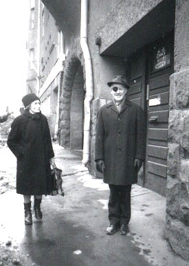 | Luotsikatu 4:n edessä seisova mies, jolla silmälappu päässä sekä ohikulkeva nainen. | |