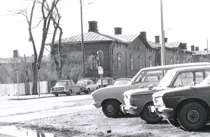 | Näkymä auton ikkunasta Ruoholahdenkadulta Lastenkodinkadun kulmalta lounaaseen. Etualalla parkkeerattuja autoja. Taustalla puutaloja, Ruoholahden sadan markan villoja. | |