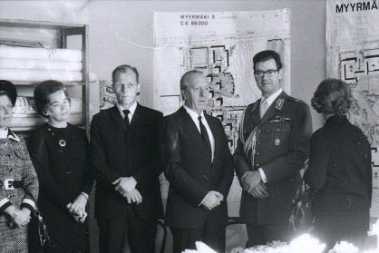 | Hautajaisvieraita arkkitehti Pentti Aholan muistotilaisuudessa arkkitehtitoimistossa Rauhankatu 13:ssa. | |