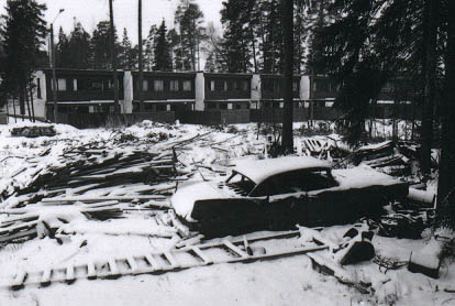 | Lumen peittämä autonrämä ja puutavaraa Yliskylässä. Taustalla kaksikerroksisia rivitaloja, Ilomäenpolku 3. | |