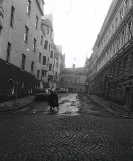 | Kulmakatu kostean sumuisessa säässä Meritullinkadun kulmasta länteen. | |
