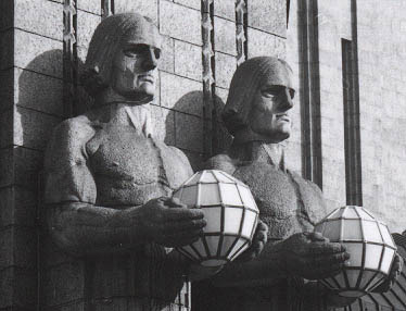 | Kuvanveistäjä Emil Wikströmin veistämät graniittiset Lyhdynkantajat-hahmot Helsingin rautatieaseman pääsisäänkäynnin molemmin puolin. | |
