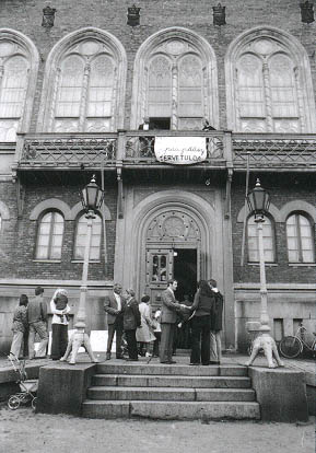 | Ihmisiä Ritarihuoneen edustalla Kruununhaan asukasyhdistyksen järjestämässä juhlassa Helsinki-päivänä 12.6.1975. | |