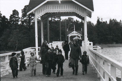 | Vironniemen päiväkodin retki Seurasaareen. Päiväkodin aikuisia ja lapsia tulossa mantereelta Seurasaarensillalla saareen. | |