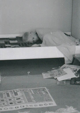 | Aapo Rista, 6 v, nukahtaneena päivällä kesken leikkien sänkyynsä Liisankatu 7:ssä. | |