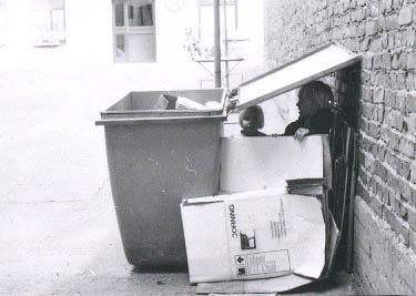 | Lapsia leikkimässä pahvilaatikoista tekemässään majassa Liisankatu 7:n pihassa. | |