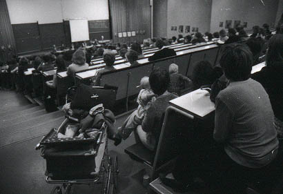 | Lasten päivähoitokysymyksiä käsittelevä kokous Porthanian suuressa luentosalissa. | |