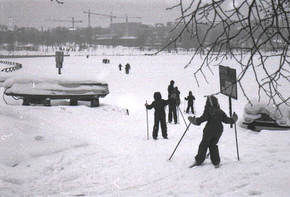 | Vironniemen päiväkodin lapsia hiihtämässä Kaisaniemenrannasta Kaisaniemenlahden jäälle. | |