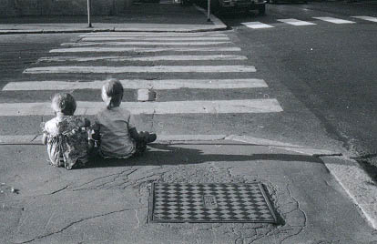 | Kaksi pikkutyttöä, Elvi Rista ja Senni Virtanen istumassa jalkakäytävällä Mariankadun ja Vironkadun kulmassa. | |