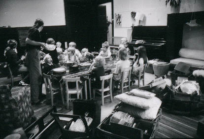 | Vironniemen päiväkodin lapsia ja henkilökuntaa muuttolaatikoiden keskellä Rauhankatu 13:ssa juuri ennen päiväkodin muuttoa remontin tieltä seurakunnalta vuokrattuihin tiloihin Meritullintorille. | |