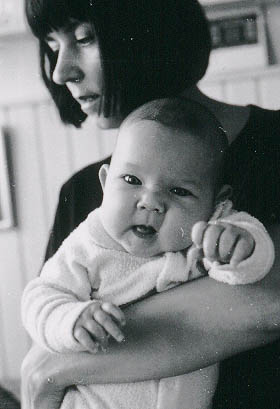 | Muutaman kuukauden ikäinen Kukka Harvilahti äitinsä käsivarrella kotonaan Kulmakadulla. | |